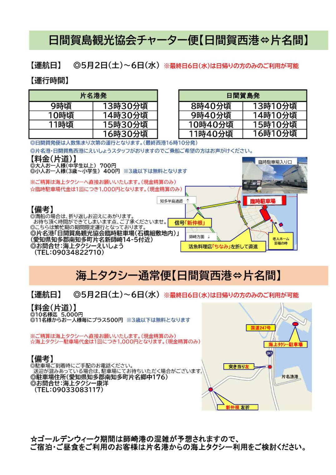 ※片名港・日間賀島西港にえいしょうスタッフがおりますので、ご乗船ご希望の方はお声がけください。満船の場合は、折り返しお迎えに上がりますので、お待ちいただく時間ができてしまいます点、ご了承くださいませ。